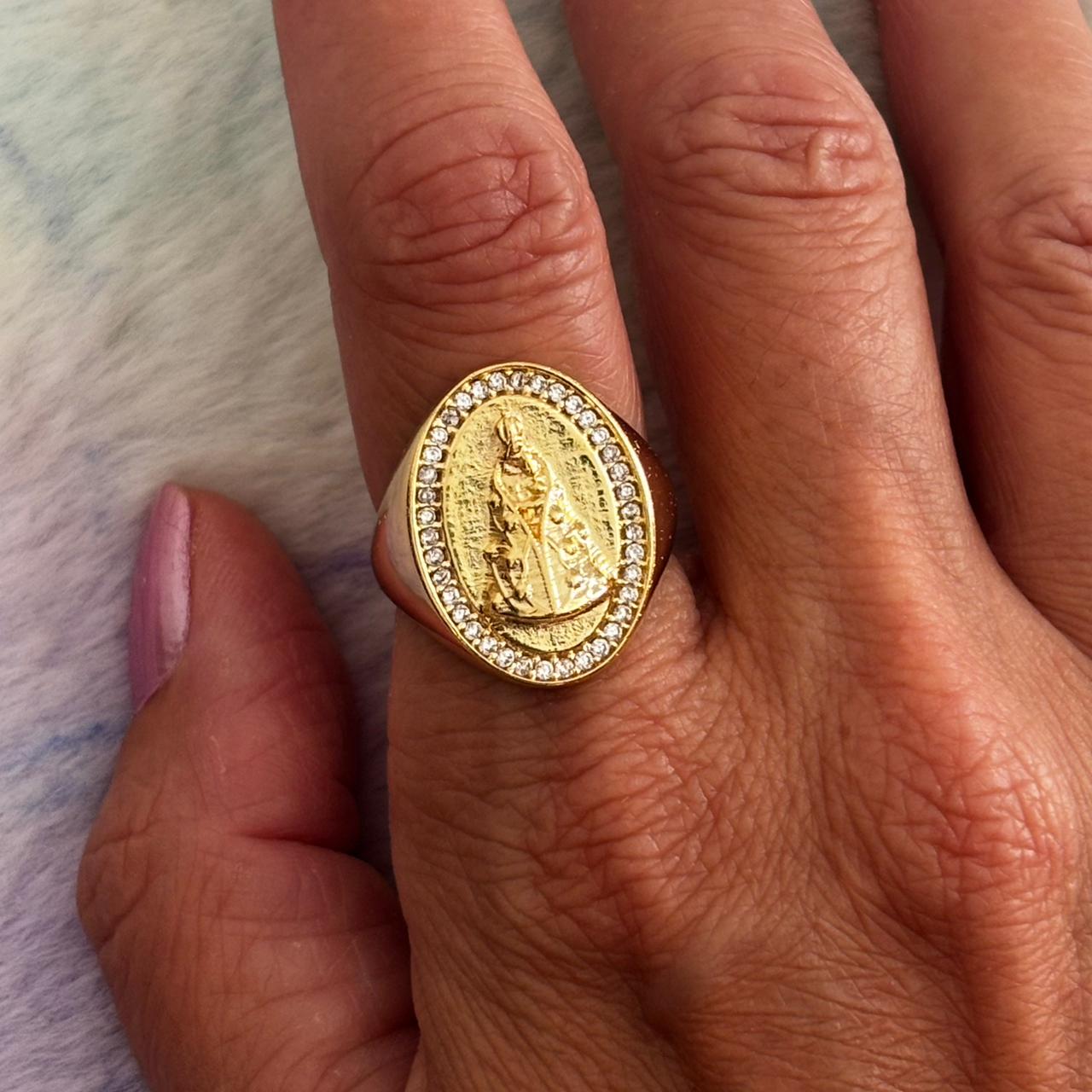 Anel feminino Nossa Senhora de Nazaré banhado a ouro amarelo com zirconias brancas