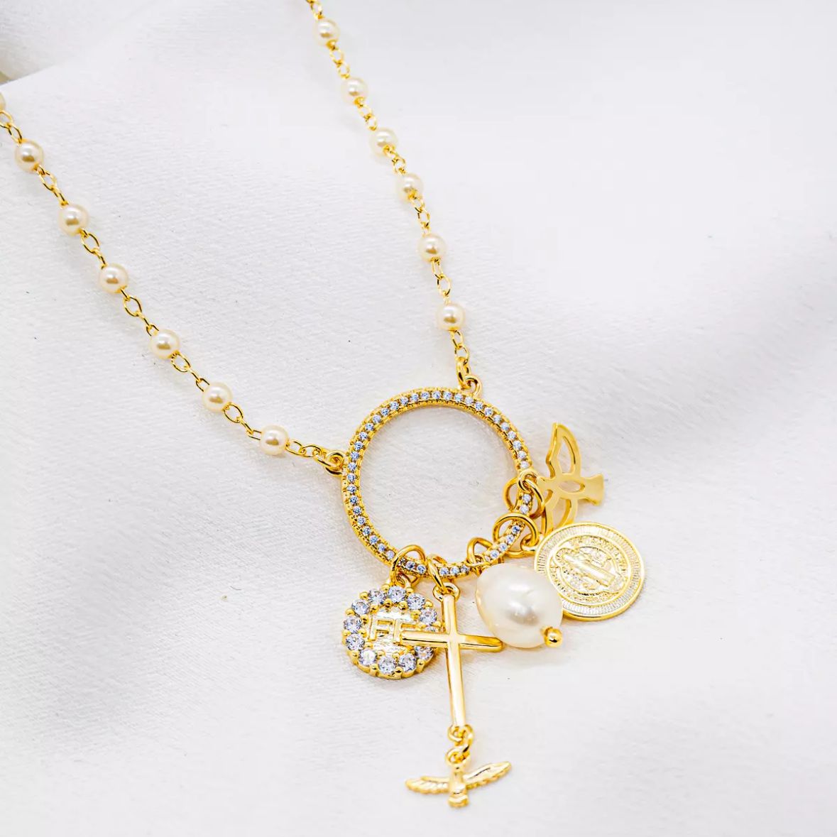 Colar Longo Patuá Religioso Pérolas Banho com garantia de 1 ano. Acompanhado por corrente pérolas com 60 cm.